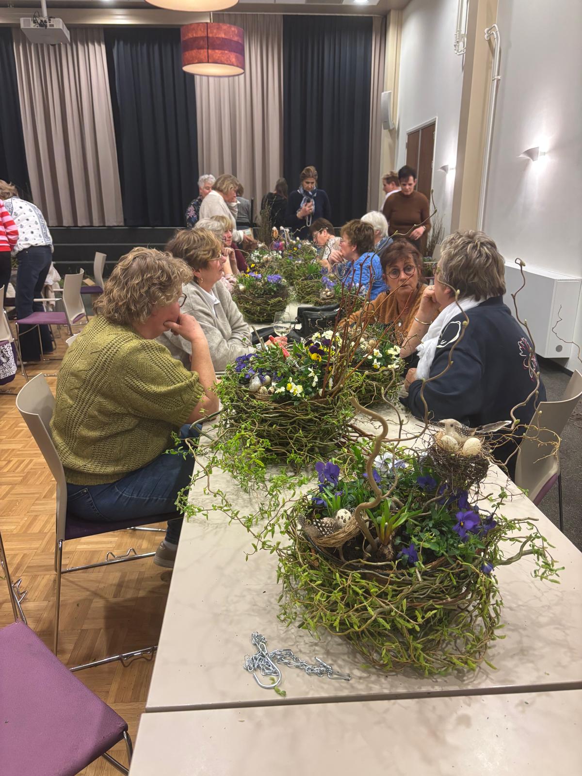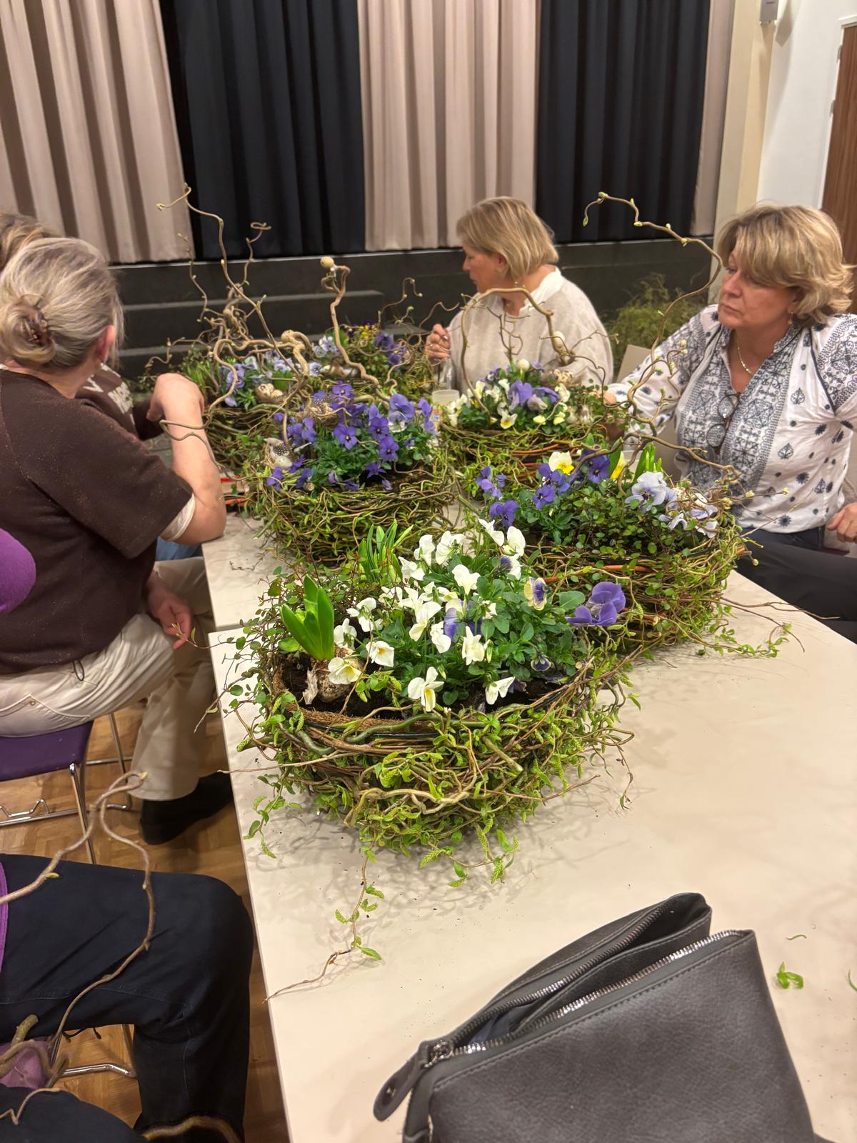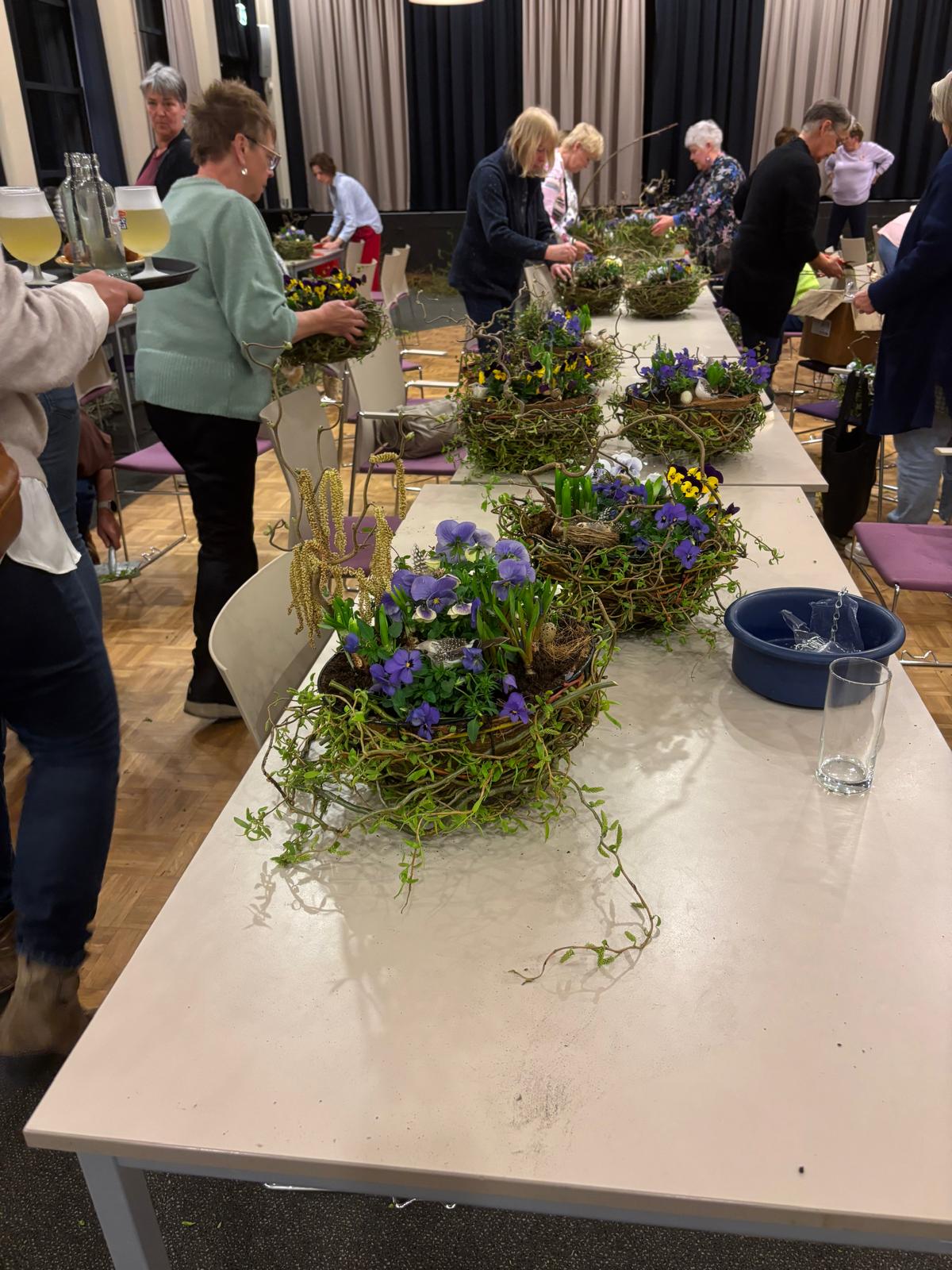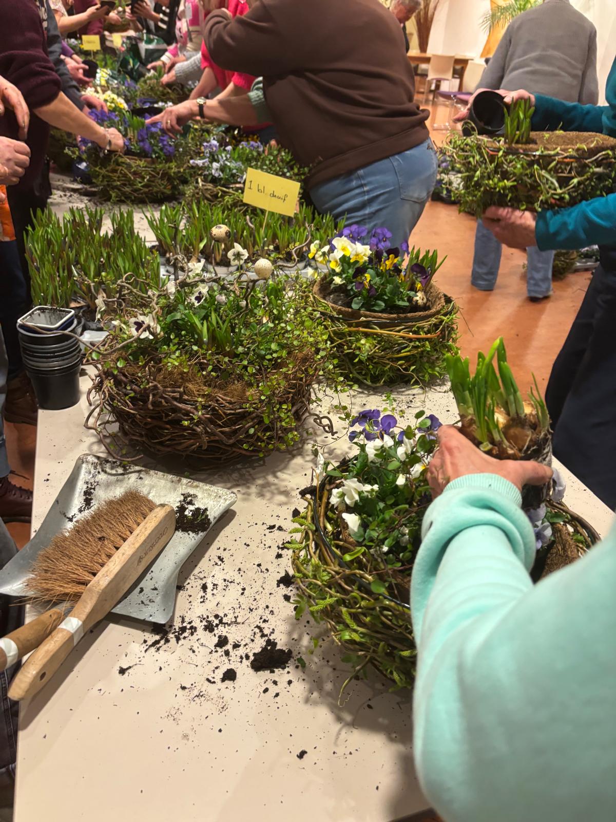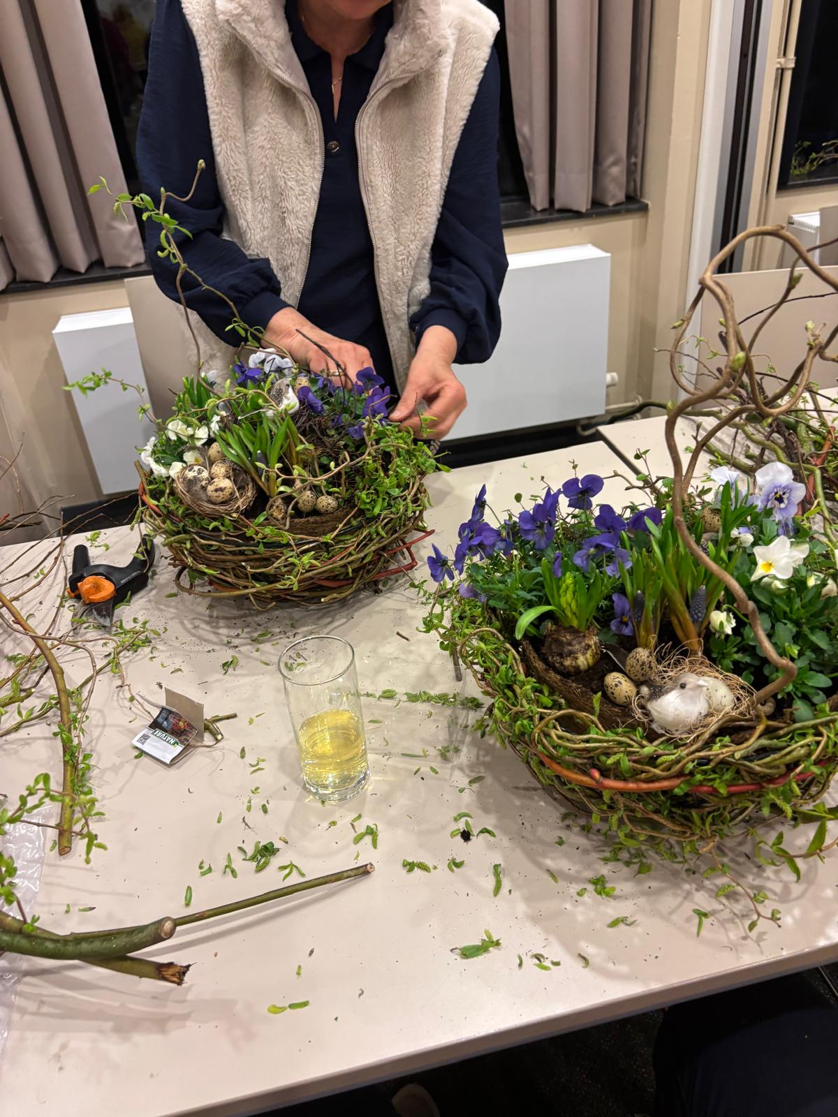 Onder de creatieve leiding van Agnes en Nelleke maakten we samen prachtige voorjaarsnesten van wilgentakken in een metalen basket, gevuld met o.a. viooltjes, bloembollentjes en Muehlenbeckia.