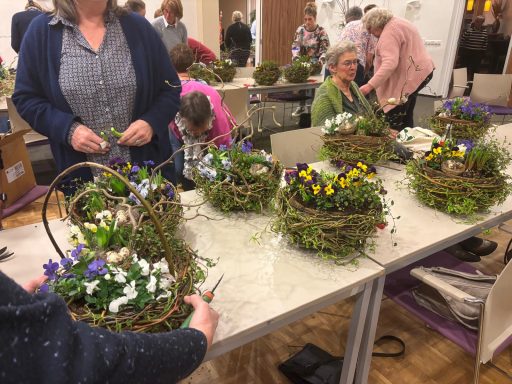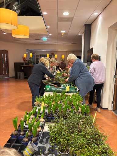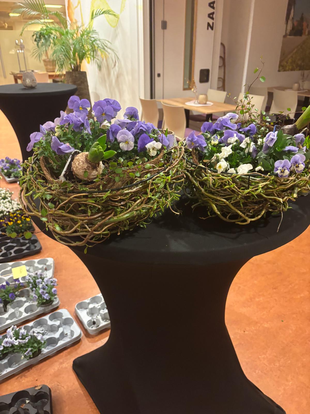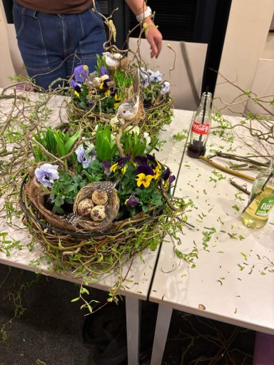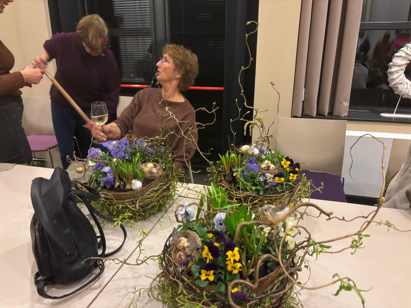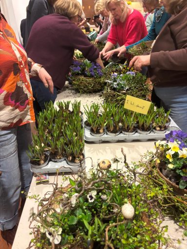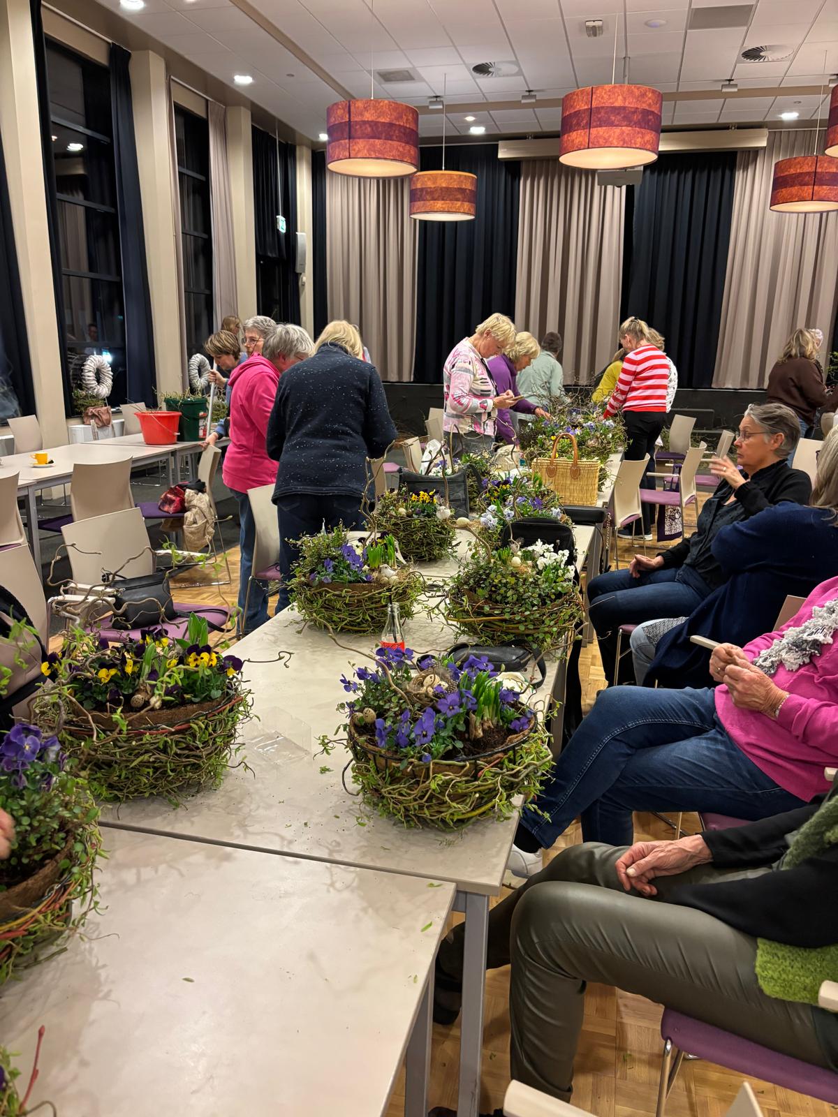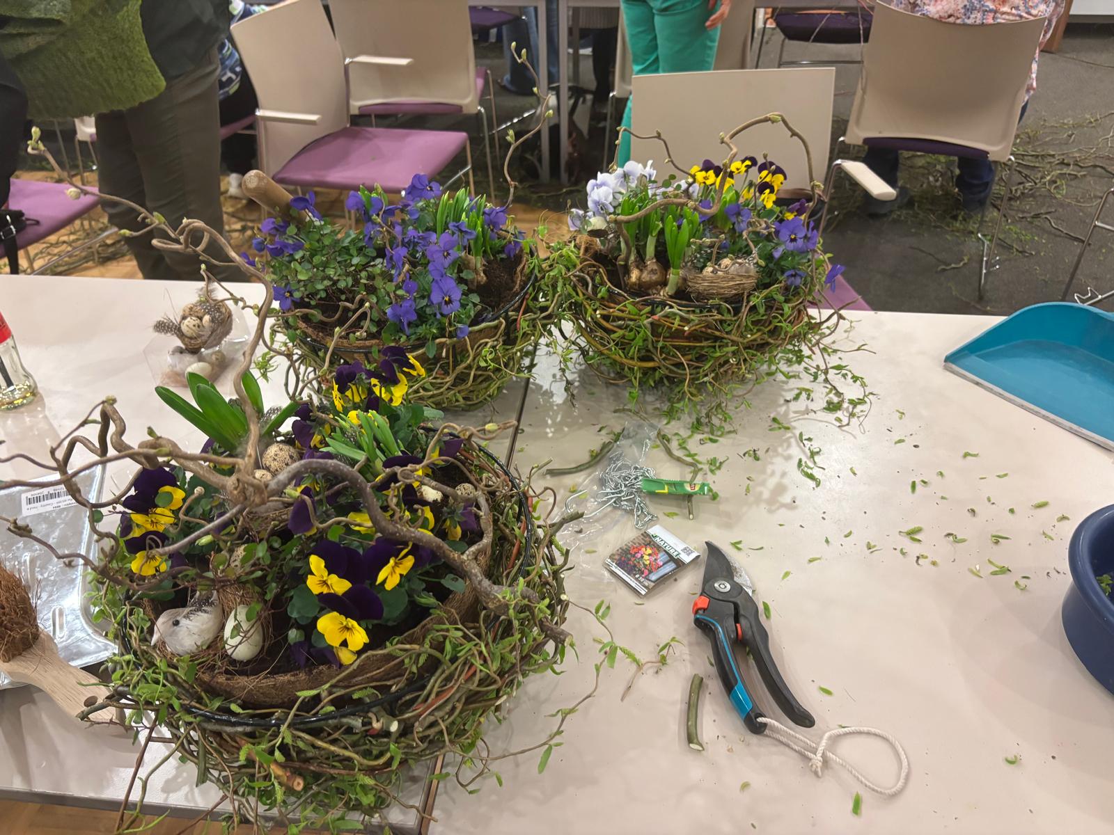 Onder de creatieve leiding van Agnes en Nelleke maakten we samen prachtige voorjaarsnesten van wilgentakken in een metalen basket, gevuld met o.a. viooltjes, bloembollentjes en Muehlenbeckia.